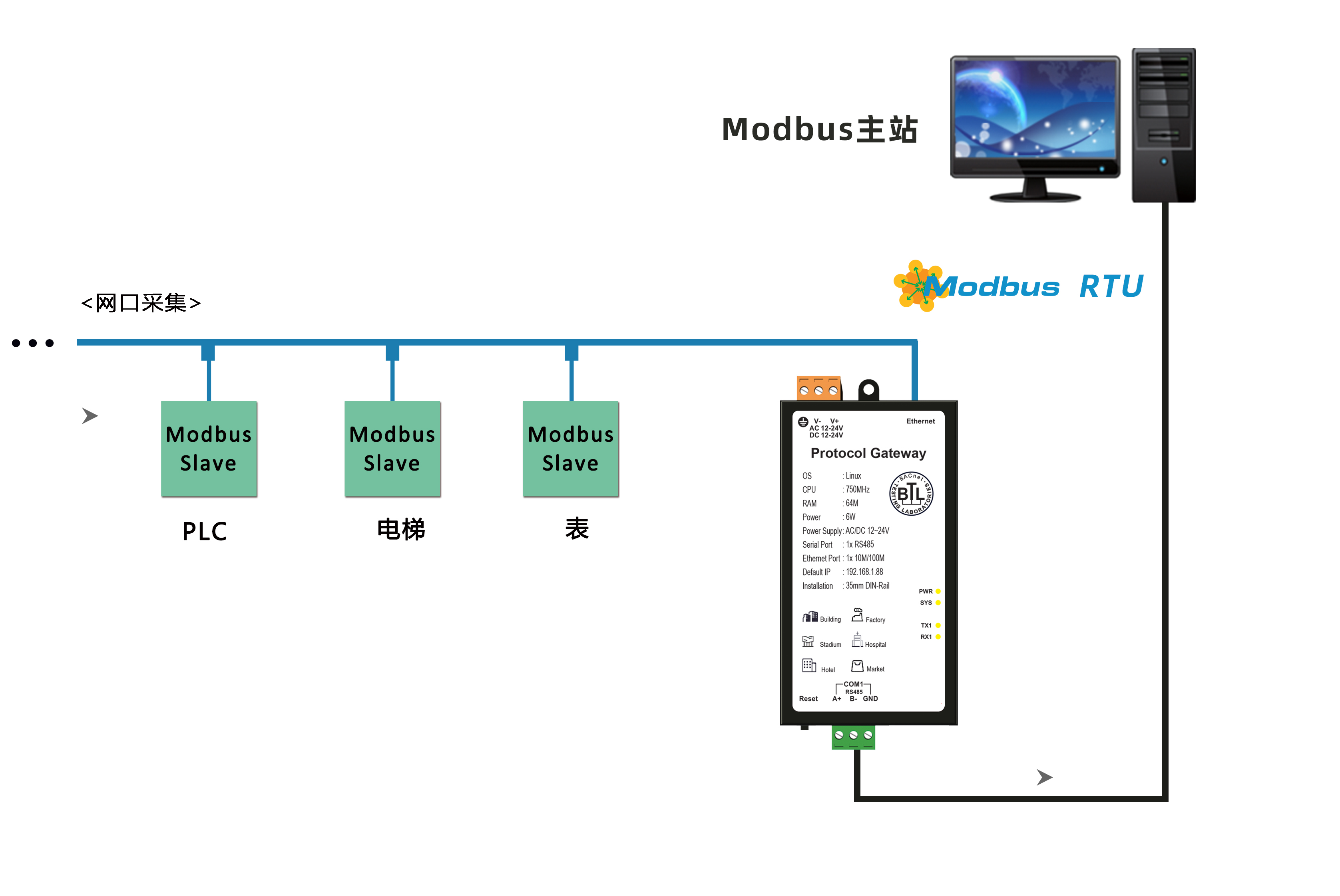 | -支持采集Modbus、BACnet协议同时转为Modbus TCP/RTU服务器; |