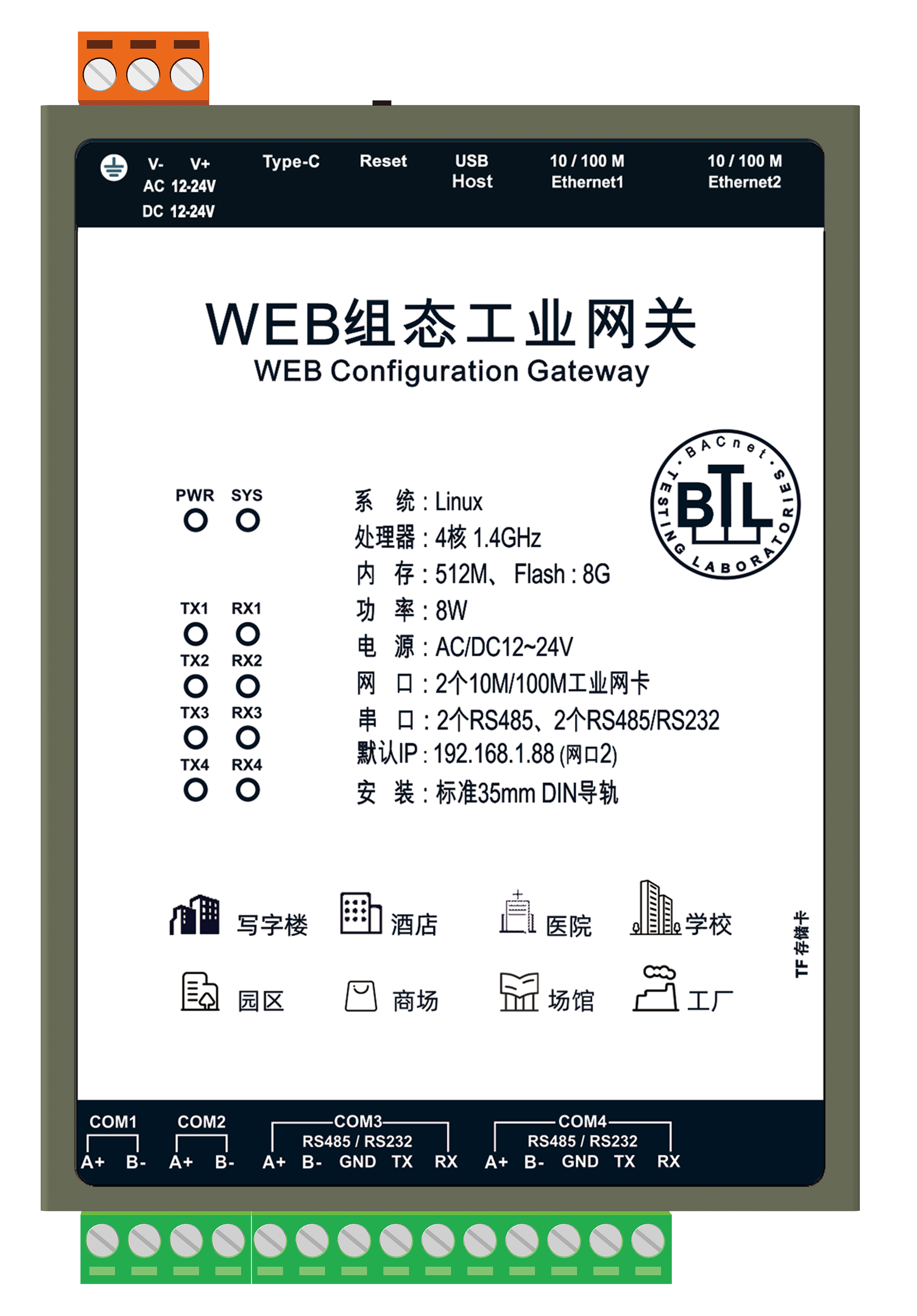 7.3 HMI2004-A9网关 WEB组态网关HMI2004-A9配合组态编辑软件X2View可实现现场数据采集,并直接转为组态画面进行数据实时监控。用户无需购买组态软件,只需用电脑、手机、iPad或自带浏览器功能的设备即可登录组态画面进行监控,实现远程监控设备启停、运行等操作,给用户带来良好的操作体验。同时具有微信报警、钉钉报警、邮件报警、MQTT服务、工程上传云端等功能;还可以转发为BACnet 服务器、Modbus服务器,OPC UA服务器,开放数据接口被第三方的系统集成。
