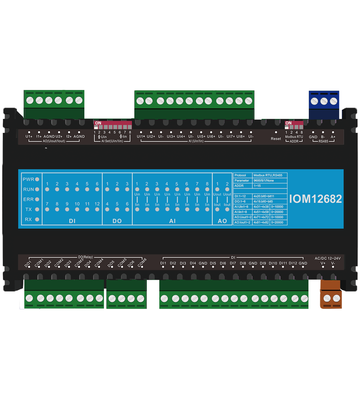 模拟量AI默认电流信号, 如需接入电压信号,将相对应的Uin拨码(Uin拨码中的8个开关对应着模拟量输入的8个端