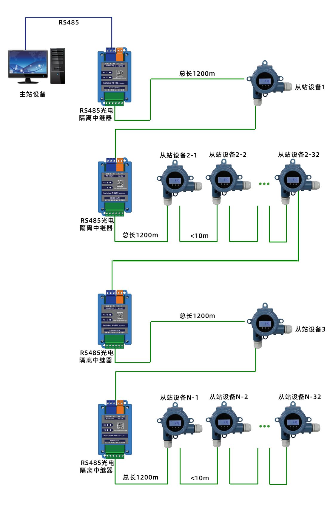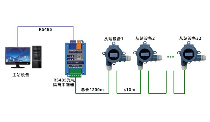 点对多:连接32个485输出设备,相邻485设备距离不超过10m,延长总线总长1200m。